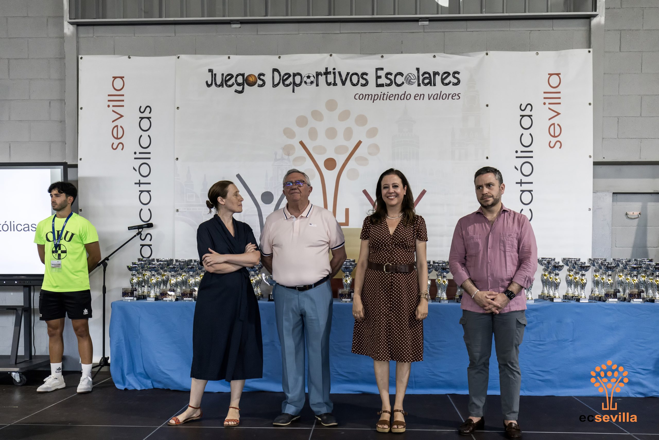 A la finalización de la misma tuvo lugar la ceremonia de entrega de trofeos, presentada por Manuel García, Coordinador del Departamento de Deporte Escolar y Valores y Secretario Técnico de Escuelas Católicas Sevilla. En ella, tuvimos el honor de contar con la presidente de nuestra institución y directora del colegio Santa Joaquina De Vedruna, Rocío Guerrero; nuestro vicepresidente y director del colegio salesiano San Juan Bosco de Morón de la Frontera, José María Santos; y Raquel Ruiz, miembro de la Junta Provincial y directora del colegio Ntra. Sra. De Los Reyes – SAFA. En representación de la Fundación CEU San Pablo disfrutamos de la presencia de Rafael Barea, subdirector del colegio CEU San Pablo.